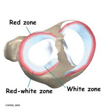 The architecture of the vascular supply to the meniscus has important implications for healing. Capillaries penetrate the menisci from the periphery to provide nourisment. After 18 months of age, as weight bearing increases, the blood supply to the central part of the menisci recedes. Researches have showned that eventually only peripheral 10% to 30% of the menisci or red zone receives this capillary network.
